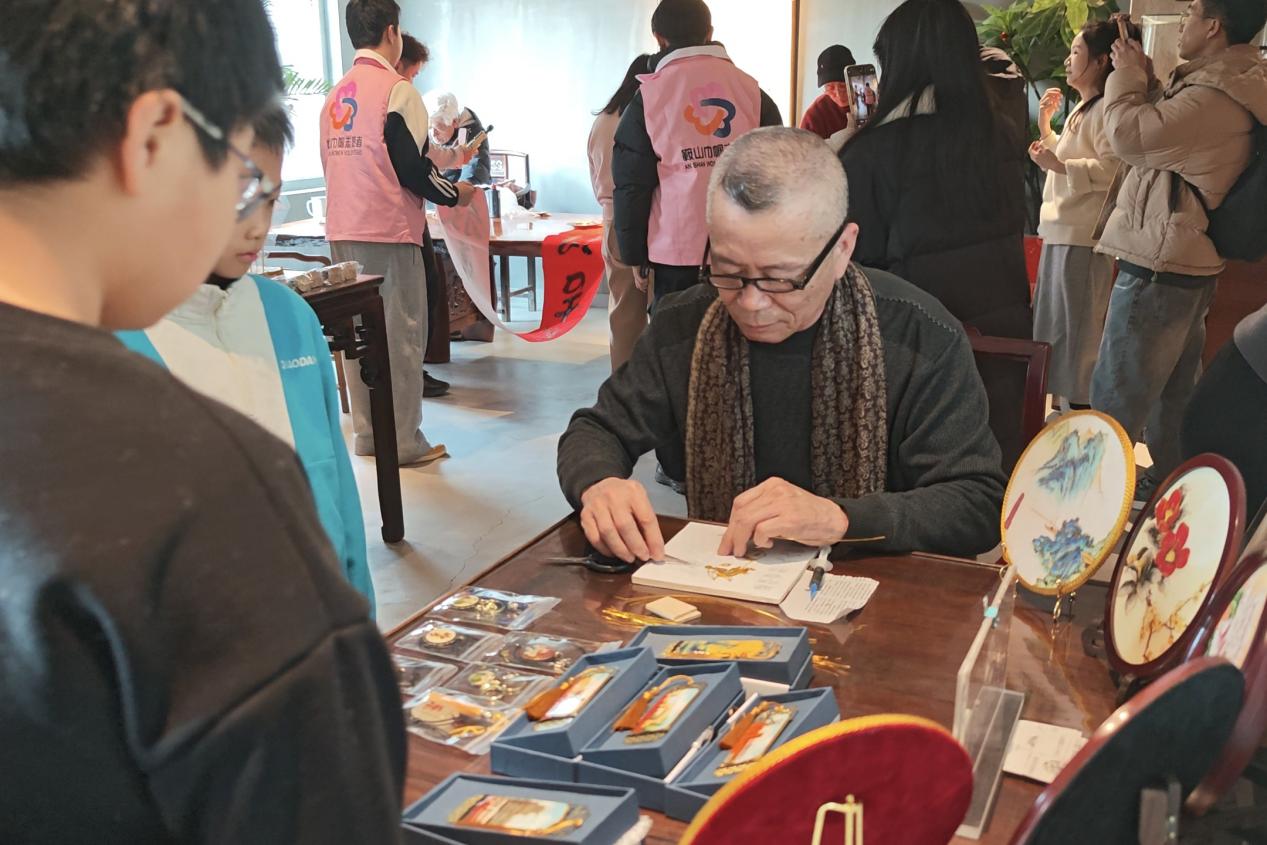 1月31日,位于鞍山市铁西区大陆街道的淘李书店内,书法爱好者挥毫泼墨,笔走龙蛇间,一幅幅饱含新春祝福的春联与福字跃然纸上,并免费赠予辖区居民。与此同时,文创扇子推广区人头攒动,一柄柄融合传统纹样与现代审美的文创扇,兼具实用价值与文化内涵,不仅成为居民青睐的新春好物,更成为辖区企业展示特色文化、彰显品牌底蕴的鲜活载体。这些场景是发生在铁西区“文创风华·非遗雅集”系列活动启动仪式上的片段。